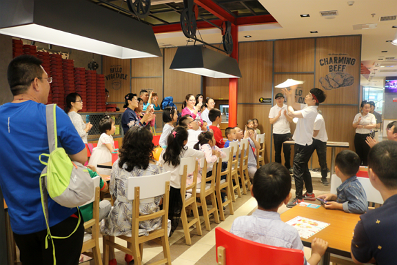 烤制期間家長(zhǎng)和小朋友們一起觀看精彩的飛餅表演
