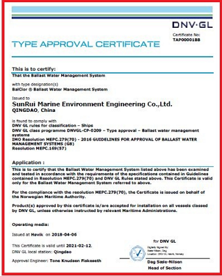 2018年4月6日,青島雙瑞海洋環(huán)境工程股份有限公司(以下簡稱青島雙瑞)BalClor?船舶壓載水管理系統(tǒng)(BWMS)全球首獲挪威船級社(DNVGL)代表挪威海事管理主管機(jī)關(guān)(NMA)頒發(fā)的基于IMO 新G8&G9導(dǎo)則的型式認(rèn)可證書。這是青島雙瑞公司繼全球第四、亞洲首家獲得美國海岸警衛(wèi)隊(duì)(USCG)型式認(rèn)可證書之后取得的又一個具有里程碑意義的重要成就。青島雙瑞獲得IMO新G8&G9認(rèn)證的BalClor?壓載水管理系統(tǒng)采用國際領(lǐng)先的高效過濾+支路電解滅活技術(shù),處理能力范圍為170-8500m3/h。